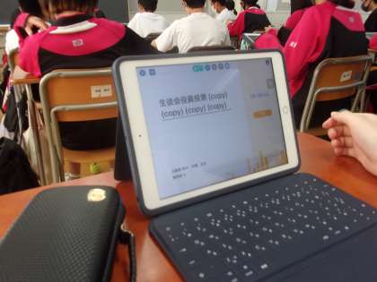 立会演説会のあとの投票は、タブレットから投票用紙を取得し無記名でオンライン上で投票いたします。タブレットが使用できない生徒には紙ベースの投票用紙を配布しました。なお、オンラインでの投票は自宅からのいわゆる在宅投票も可能です。投票結果は月曜日の朝発表します。