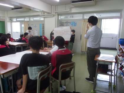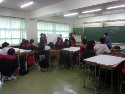 1年生は本日クラスごとに第3回目のいじめ防止プログラムの授業を受けました。今日は、「どこでいじめを学んだのか」をテーマに各班で話し合い、班ごとにストーリーを作って模造紙に記入し発表しました。