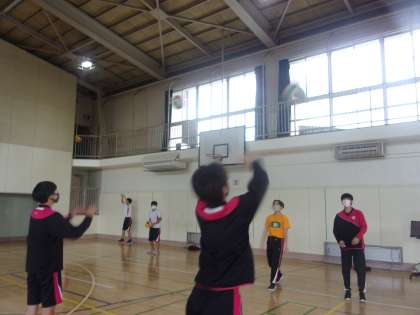 パスやサーブの練習ではどのようにすれば上達するのか、まわりで確認し合っていました。