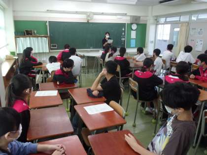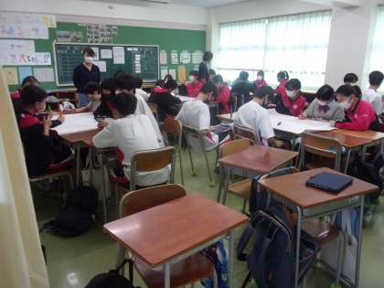 1年生は本日全クラスでいじめ防止プログラムを実施いたしました。今日は模造紙に自分のいいところを何でもいいから書いてみようというプログラムでした。