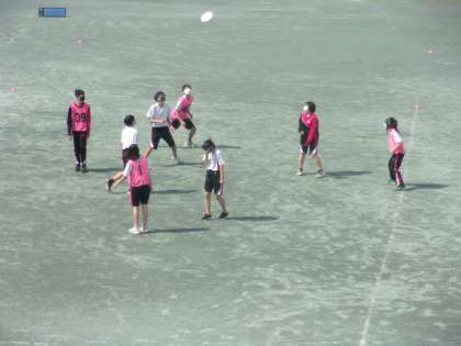 2年生の保健体育ではアルティメットを行っています。前半はフリスビーでパス交換をした後後半は男女合同チームでアルティメットの試合を行いました。