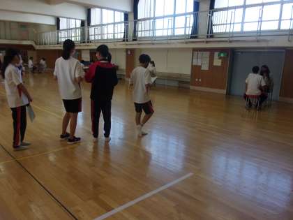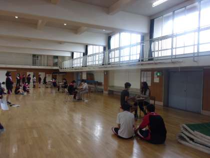 格技室で列をつくって・・?今日は2年生のスピーキングテストを格技室で行いました。