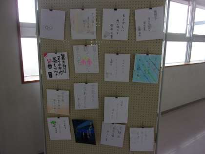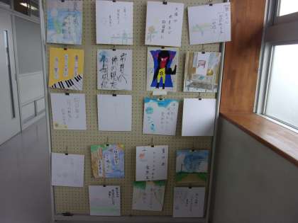 俳画はフックにクリップで止めてあります。下に落ちやすいので手を触れないで鑑賞してください。