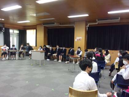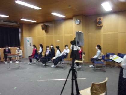 明日の生徒総会はコロナ対策でオンラインで行います。そのため本日の放課後、生徒会執行部、議長団、各種委員会委員長、質問者が音楽室にあつまり動画撮影を行いました。