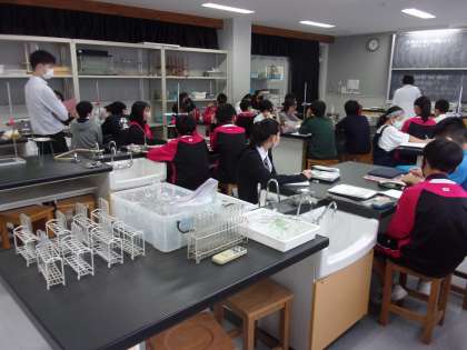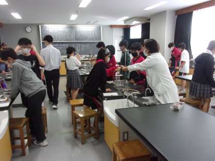 2学期より1年生の理科ではティームティーチングによる授業が始まりました。きょうは物質の状態変化の単元で物質の沸点の違いを利用して赤ワインからエタノールを取り出す実験を行いました。
