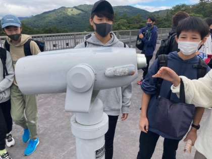 屋外の望遠鏡で河口湖の豊かな自然を見ています。