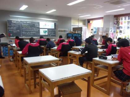 2年生の美術では」心のイメージを形に」をねらいとした抽象絵画に取り組んでいました。来週以降廊下に展示するそうです。