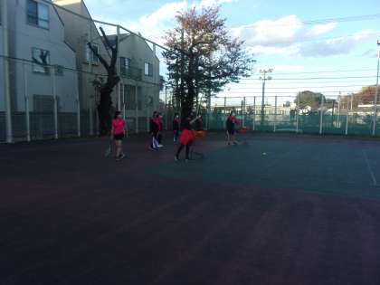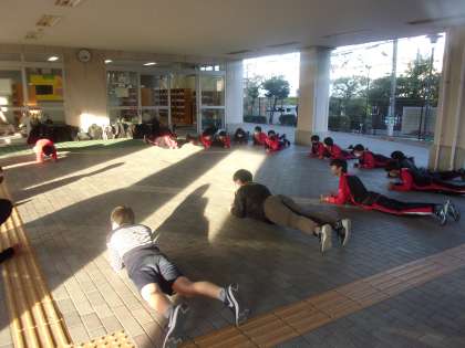テニス部です。本日はテニスコートが女子の練習日となっているため男子はピロティで筋トレ、女子はコートと室内に分かれて体験を行いました。
