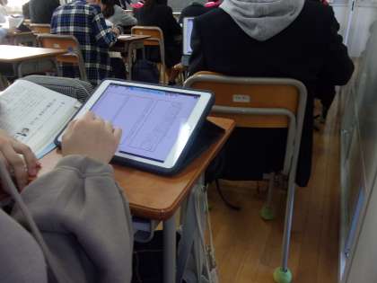 これまでは授業中にノートをとることが当たり前でした。本校では授業で使うワークシートをタブレットにとり入れて、手書きで入力するといった方法もすっかり定着してきました。もちろんこれまでのようにノートや紙ベースワークシートを使うこともできます。担当の先生と相談し自分に合った方法を選びましょう。