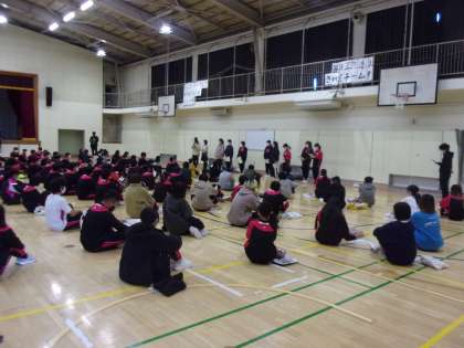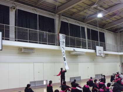 2年生は明日鎌倉方面で校外学習を実施いたします。今日は前日の確認が行われました。集会の最初に実行委員会からサプライズでスローガンの垂れ幕が披露されました。