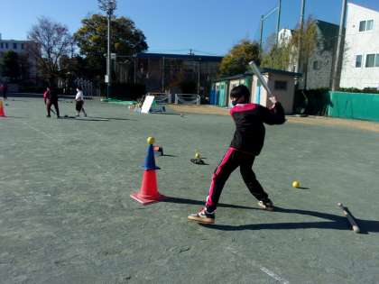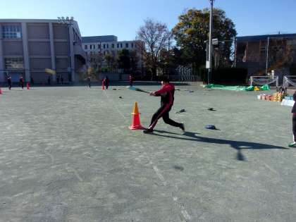 1年生の体育はソフトボールを行っています。今日はバッティング練習を兼ねてボールをティーアップして打つティーボールを行いました。止まっているボールでも意外と難しいようですが、中には特大ホームランをかっとばす生徒もいました。