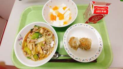 生徒作成献立、今年度の最終回は中華の献立です。サンマ—メンという肉野菜あんをかけたラーメンで、野菜もしっかり食べられる献立です。しゅうまいと杏仁豆腐という組み合わせも好評でした。