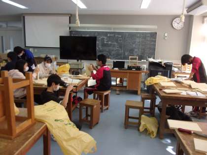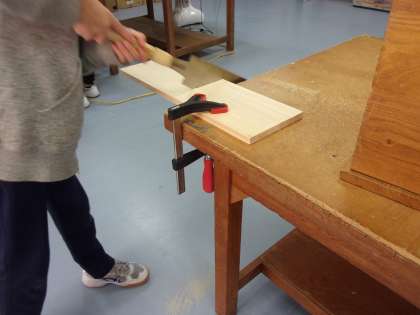 1年生の技術では木工細工で本箱の制作を行っています。のこぎりで切り、やすりで磨いて間もなくパーツが出来上がります。パーツが出来たら次は組み立てですね。
