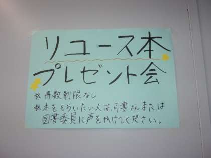 〜図書委員会より〜 図書室の蔵書の入れ替えに伴い、長年図書室にあった本を生徒対象に無料でリユースします。手にしたい本が見つかった場合は司書さんにお声掛けしてください。リユースの対象となる本は図書室前の廊下に展示してあります。なお図書室からリユースされた本はリサイクルショップなどでの買取はできませんのでご了承ください。