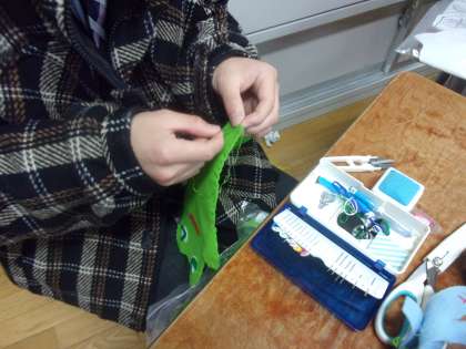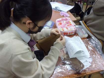 縫う作業に一苦労しながらも、真剣に取り組んでいます。