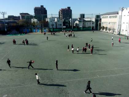 昨日と違って朝からの晴天で、昼には気温も上がってきました。多くの生徒が校庭いっぱいに広がってボール遊びをしていました。