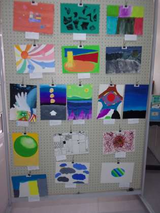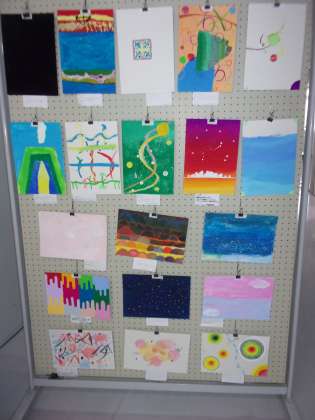 2年生の美術の作品です。心の中で思ったことなどを絵に描く抽象絵画です。ユニークな作本が目白押しです。美術室前の廊下に展示してあります。