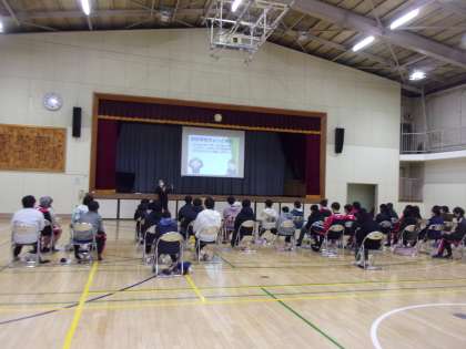 体育館では、都立第一商業から校長先生がお見えになり「商業」の授業をしてくださいました。第一商業高校は代官山にあるのですが、ひところからタピオカティーの容器が街のあちらこちらに散乱し回収が追い付かないといった問題があるとのこと。さてこれについてどんな解決策があるかを考えようといった課題出されました。「捨てられないような高級な容器にする」「誰でも捨てたくなるような素敵なごみ箱を作る」「容器のデポジットを行う」などたくさんの意見が出ました。
