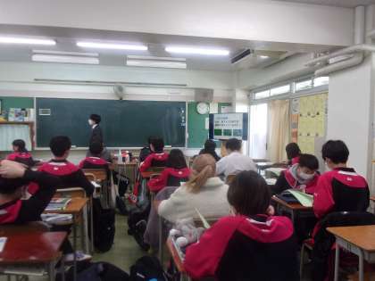 今日は世田谷区教育委員会より副参事の先生、指導主事の先生方がお見えになり、本校の教育活動を視察しご指導、ご助言をいただきました。感染症対策のため当初の予定より短時間での視察となりました。5時間目は授業を観察していただきました。写真は1年の社会の授業です。南アメリカ州の課題と将来の単元で開発か、環境保全かを話し合って意見を出し合いました。