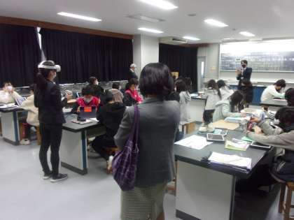 理科の授業観察です。VRを使用したネズミの解剖の授業です。かなりリアリティがあるようでした。この理科の授業には指導主事の先生のほか教育センターから2名の先生方がお見えになりご指導、ご助言をいただきました。