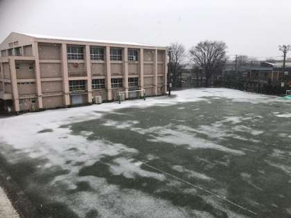 午後になって雪が強く降ってきました。校庭にもうっすらと積もってきました。道路も滑りやすくなってきているようですので、下校時には十分に気をつけましょう。