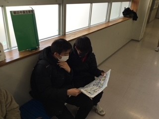休み時間などにこのベンチに座って新聞を読んでいる生徒もいます。