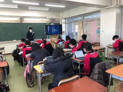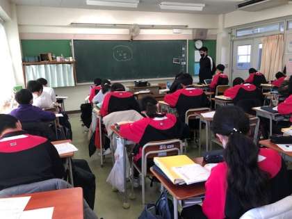 1年生の英語の授業です。授業の初めにはタブレットを使ったパズル、英単語のBINGOでまずはウォーミングアップ。それから本題に入ります。