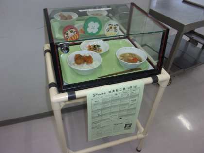 給食の直前の様子です。授業中には調理室の方々がみなさんのために給食を準備してくださっています。どのようにどのくらいの量を盛り付ければよいのかもすぐにわかるようになっていますね。