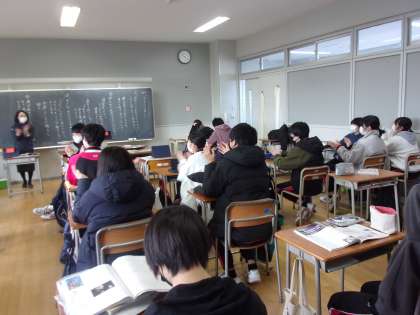 3年生の英語の授業です。ALTの先生と個別に会話を行いました。教室内ではチャンツという手法を使って”話す”ことを中心とした授業を行いました。