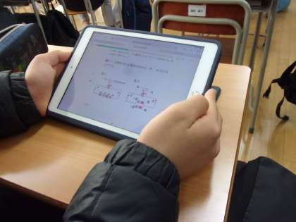 2年生の理科の授業です。今日は電流とその利用の単元のまとめを行いました。最後にキュビナを使い、それぞれに合った問題を解いて確認を行いました。