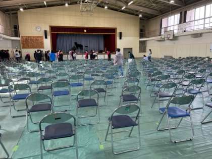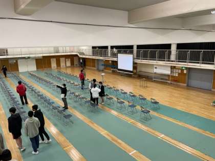 午後は合唱コンクールの準備を行いました。シートを敷き椅子を並べリモート会場にはスクリーンとプロジェクターを設置しました。これから動作確認を行います。
