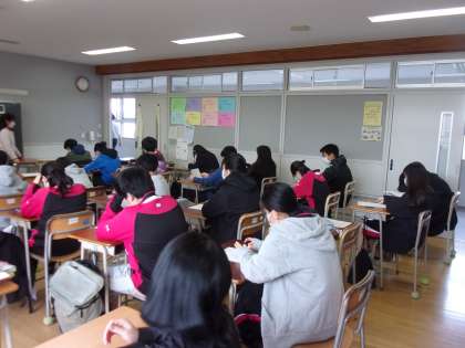 3年生の修学旅行もそろそろ大詰めですね。校内では1,2年生が一生懸命授業に取り組んでいます。こちらは2年生の英語の授業での様子です。
