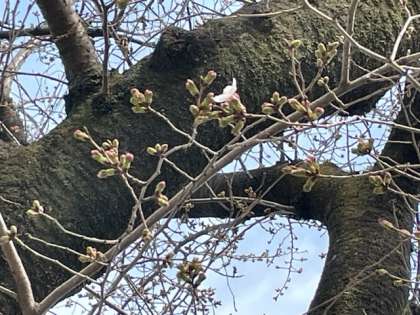正門付近の桜が、まだたった一輪ですが花を開きました。全体が開花するのももう間近ですね。