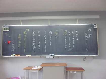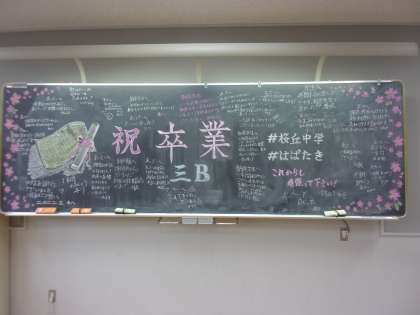教室の黒板には担任の先生からの思いが込められた文章や、寄せ書き、黒板アートが描かれていました。写真はA組 B組の黒板です。