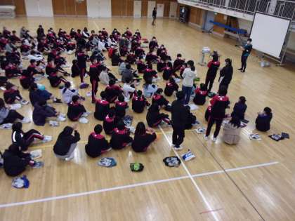 1年生は格技室で学年集会を行いました。