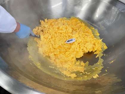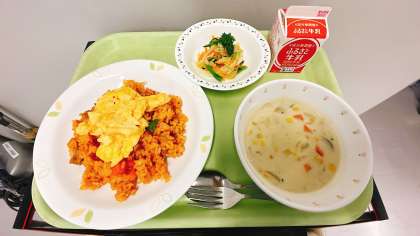 今日は今年度最後の給食です。オムチキライスや、菜の花を使ったサラダなど、春らしい彩りの献立でした。オムチキライスの卵は、少しずつゆっくり加熱して作りました。しっとり仕上げましたが温度確認はしっかりと。