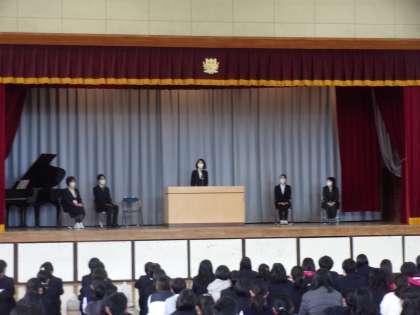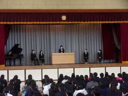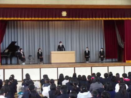 始業式の前に本年度本校に赴任した教職員の着任式を行いました。副校長先生、数学の先生、英語の先生の順で紹介いたしました。