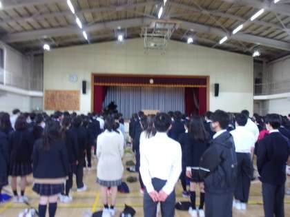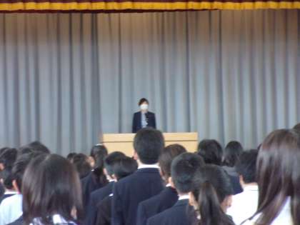 続いて生徒支援部長の先生から学校生活の心得についてのお話がありました。最後は音楽の先生の伴奏で校歌を斉唱しました。