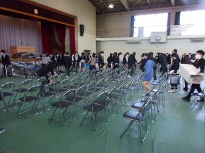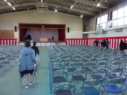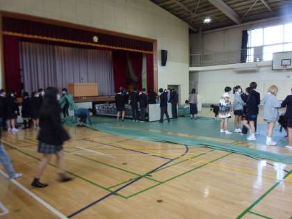 学活のあと3年生が中心になり式場の準備を行いました。シートをきれいに張り、椅子を並べ、紅白幕をはり壇上の準備、表示と手際よく行うことが出来ました。