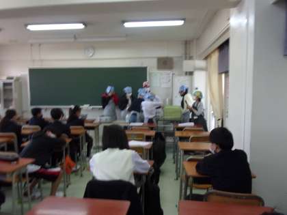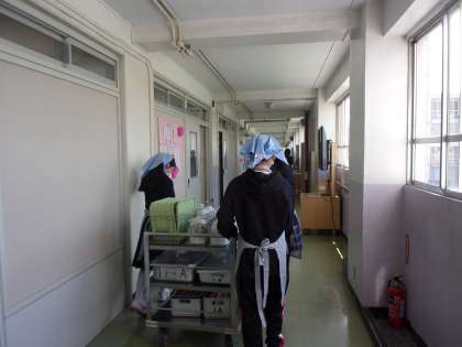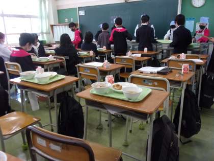 今日から給食が始まりました。1年生にとっては初めての中学校での給食ですね。給食当番がワゴンで教室に運び配膳準備が済んだら一人ずつトレーをもって自席に給食を運んできます。初めてでしたがどのクラスも大変スムーズに準備ができました。