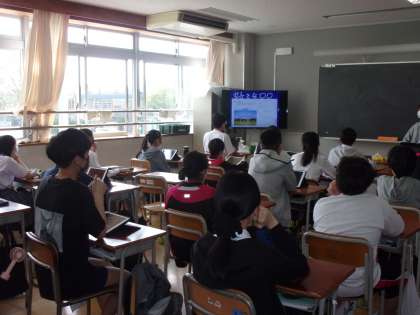 2年生の自己紹介の様子です。それぞれがプレゼンテーションソフトを使って作成した自己紹介の画像をロイロノートで送って、全体で共有しながら自己紹介を行いました。