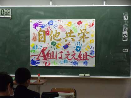 今週は各クラスで学級目標について話し合いました。写真は2年A組の学級目標です。「自他共栄」 〜A組はええ組〜 素敵な目標ですね。クラス全員の手形を添えて出来上がりました。