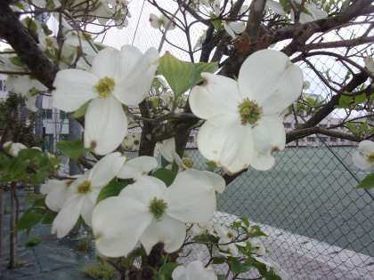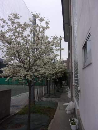 今にも泣きだしそうな空の下ですが、北校舎の前のハナミズキが真っ白な花を咲かせています。今週が見ごろでしょうね。