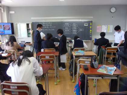 2年生の歴史の授業では、江戸時代の対外政策で江戸幕府はオランダにはどのような条件で貿易を許可したのかについてグループで話し合いました。