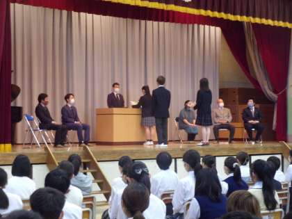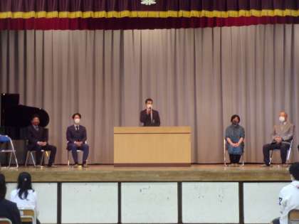 ここからは離任された先生方のお話です。前副校長先生のお話です。生徒代表の言葉と花束贈呈は生徒会執行部が行いました。