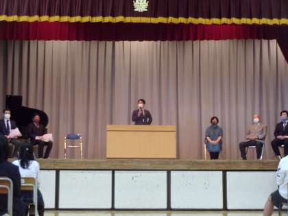 元3年の国語の先生です。生徒代表の言葉と花束贈呈は野球部が行いました。
