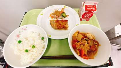 旬のグリンピースを使ってご飯を炊きました。1つ1つ給食室でサヤをむいた新鮮なグリンピースは、食感も風味も冷凍のものとは違います。グリンピースが苦手な人もいますが、旬の味を知ってほしくて一年に一度提供しています。