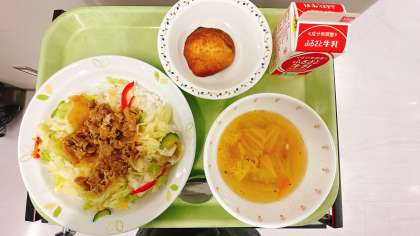 佐賀県のご当地メニュー【シシリアンライス】を作りました。ご飯の上にサラダ、甘辛く炒めた肉をのせてマヨネーズをかけて食べる料理です。給食でのアレンジとしてマヨネーズはお肉を炒める際に一緒に加熱して提供しました。