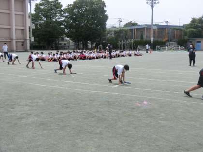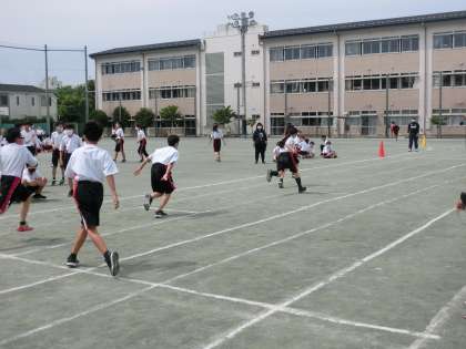1年の学年練習は全員リレーです。雨で校庭が使えなかった分を取り戻そうと必死に走りました。