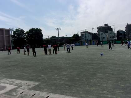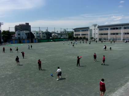 晴れた空のもと、昼休みには大勢の生徒が校庭でボール遊びをしていました。